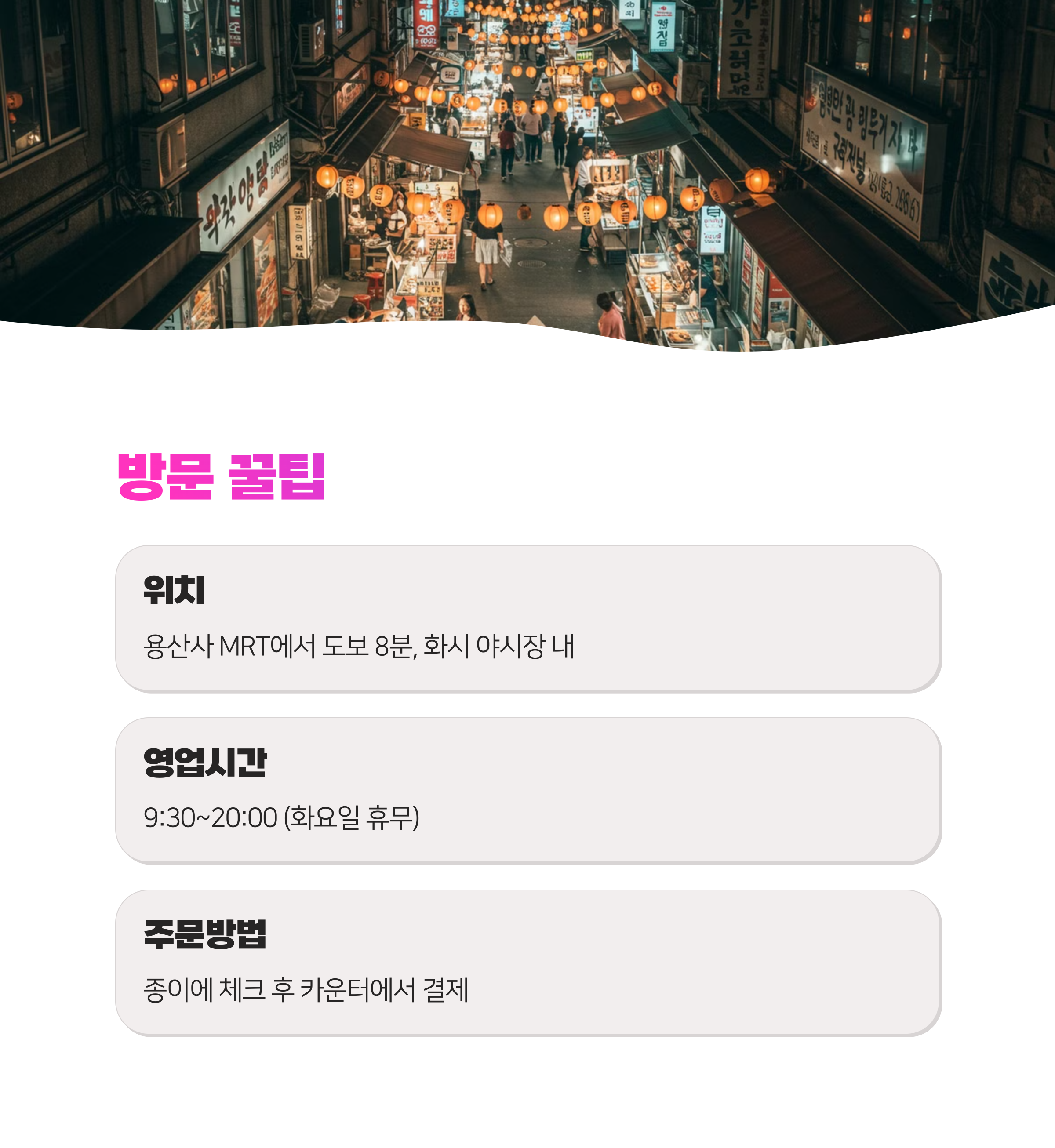 - 영업시간: 매일 오전 9:30 ~ 오후 8:00 (화요일 휴무)