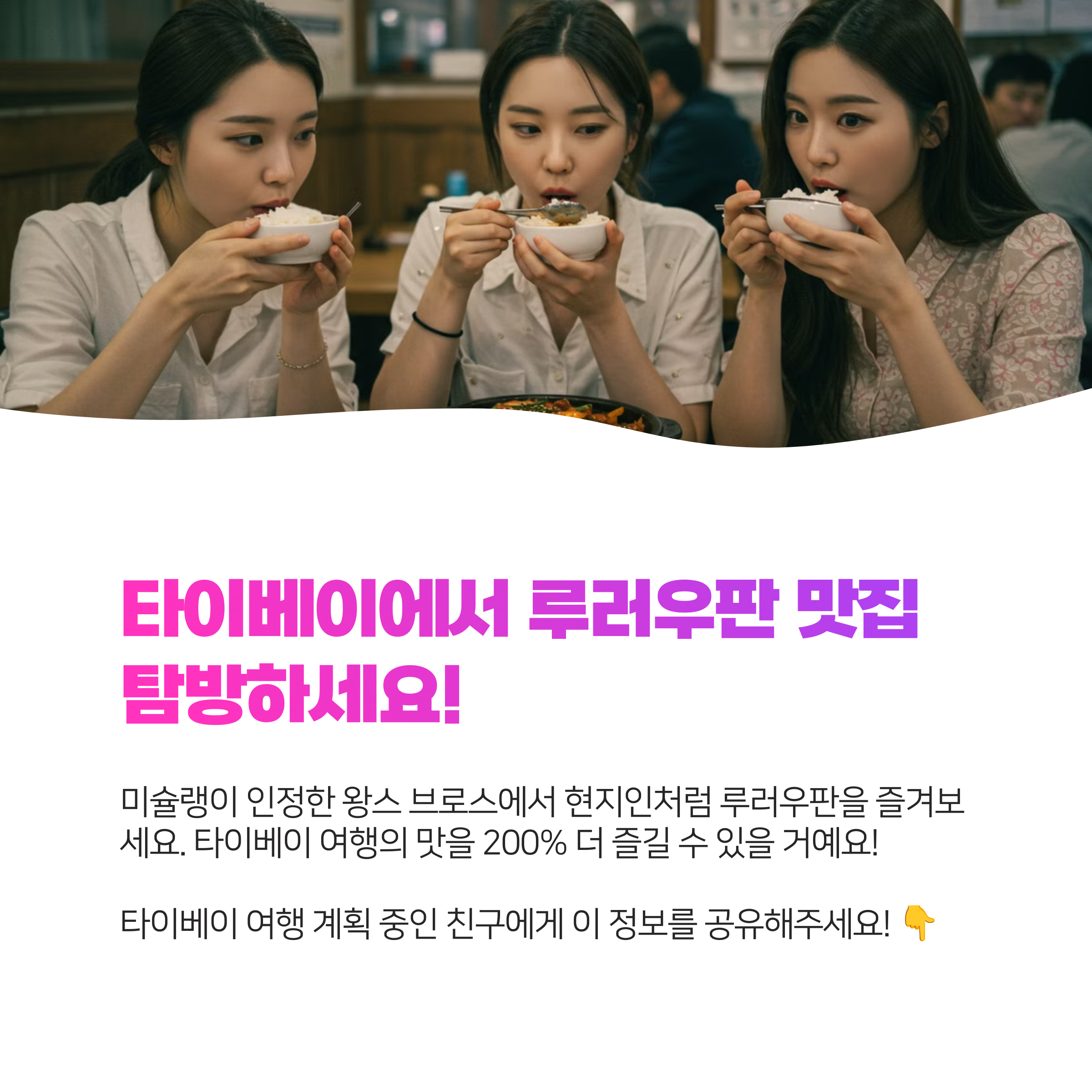 타이베이 여행에서 미슐랭이 인정한 최고의 루러우판을 맛보면, 현지인의 입맛을 진정으로 이해하게 될 거예요! 이 글을 참고해서 왕스 브로스를 방문하시면 복잡한 메뉴 고민 없이 현지인처럼 맛있게 드실 수 있답니다. 타이베이의 맛을 200% 더 즐길 수 있는 정보가 되었길 바라요! 친구들에게도 꼭 공유해주세요💕
