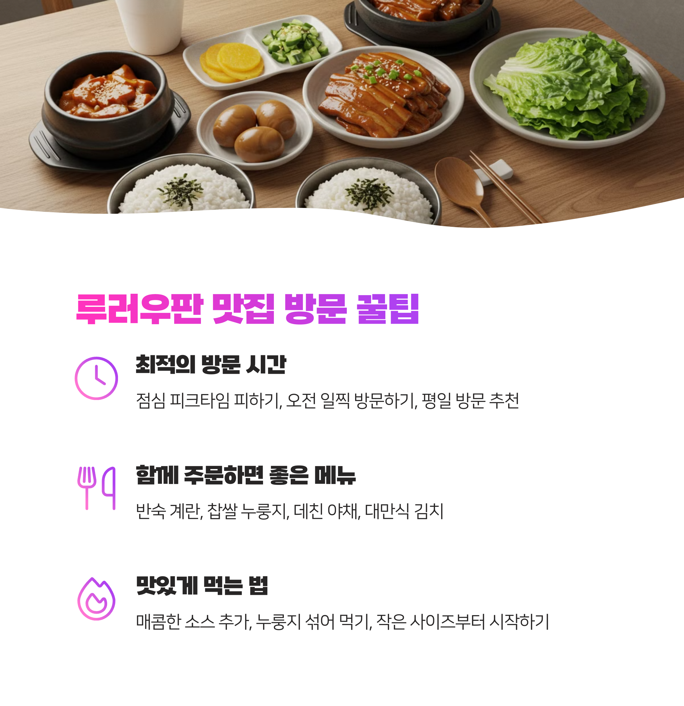 현지인들도 **이른 점심시간**이나 **브레이크 타임 전**에 많이 방문해요. 인기 맛집은 12시 전에 도착하는 것이 꿀팁입니다!