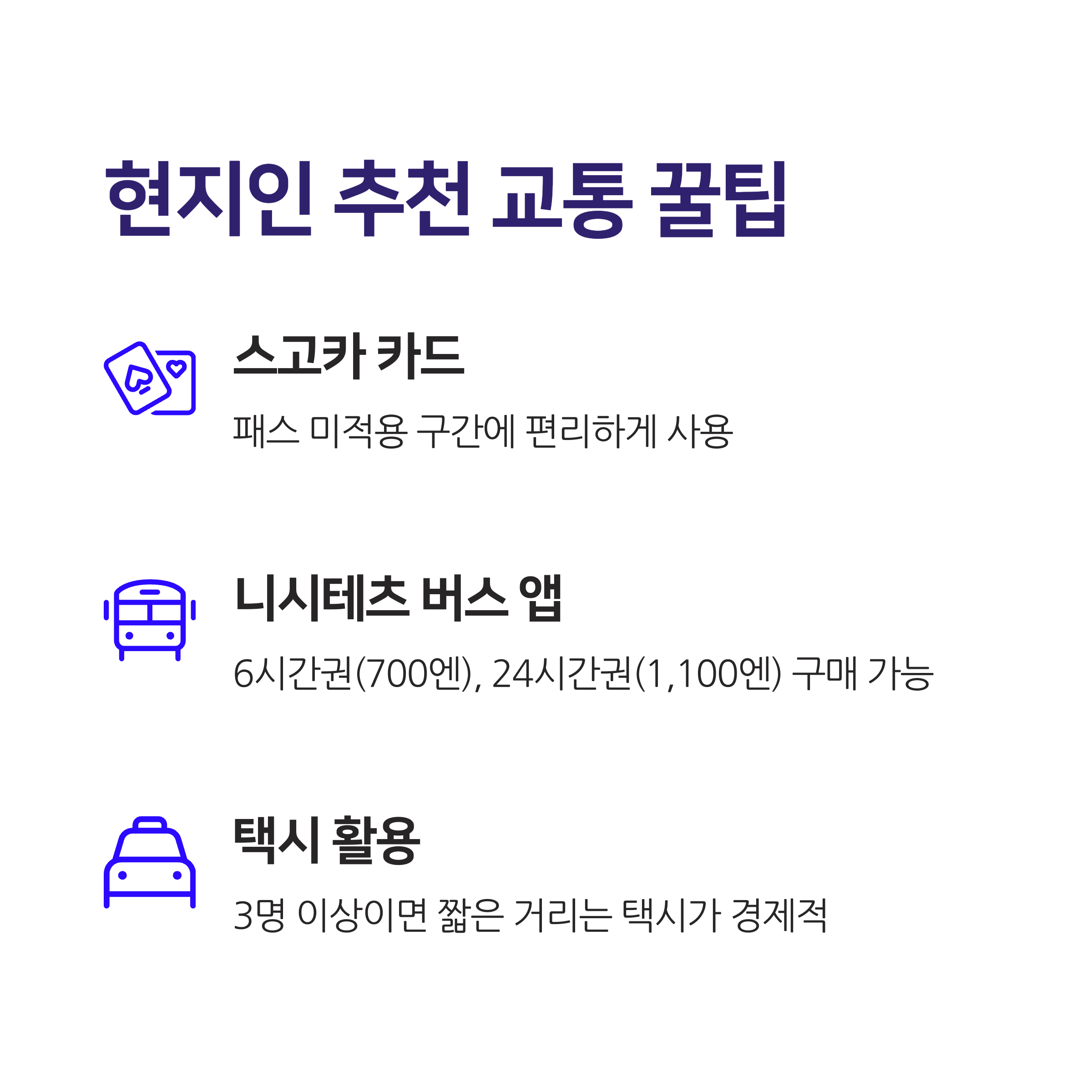 시내버스를 자주 이용한다면 마이루트 어플을 통해 6시간권(700엔)이나 24시간권(1,100엔)을 구매하는 것이 좋아요. 시간 기반으로 이용할 수 있어 더욱 효율적입니다.