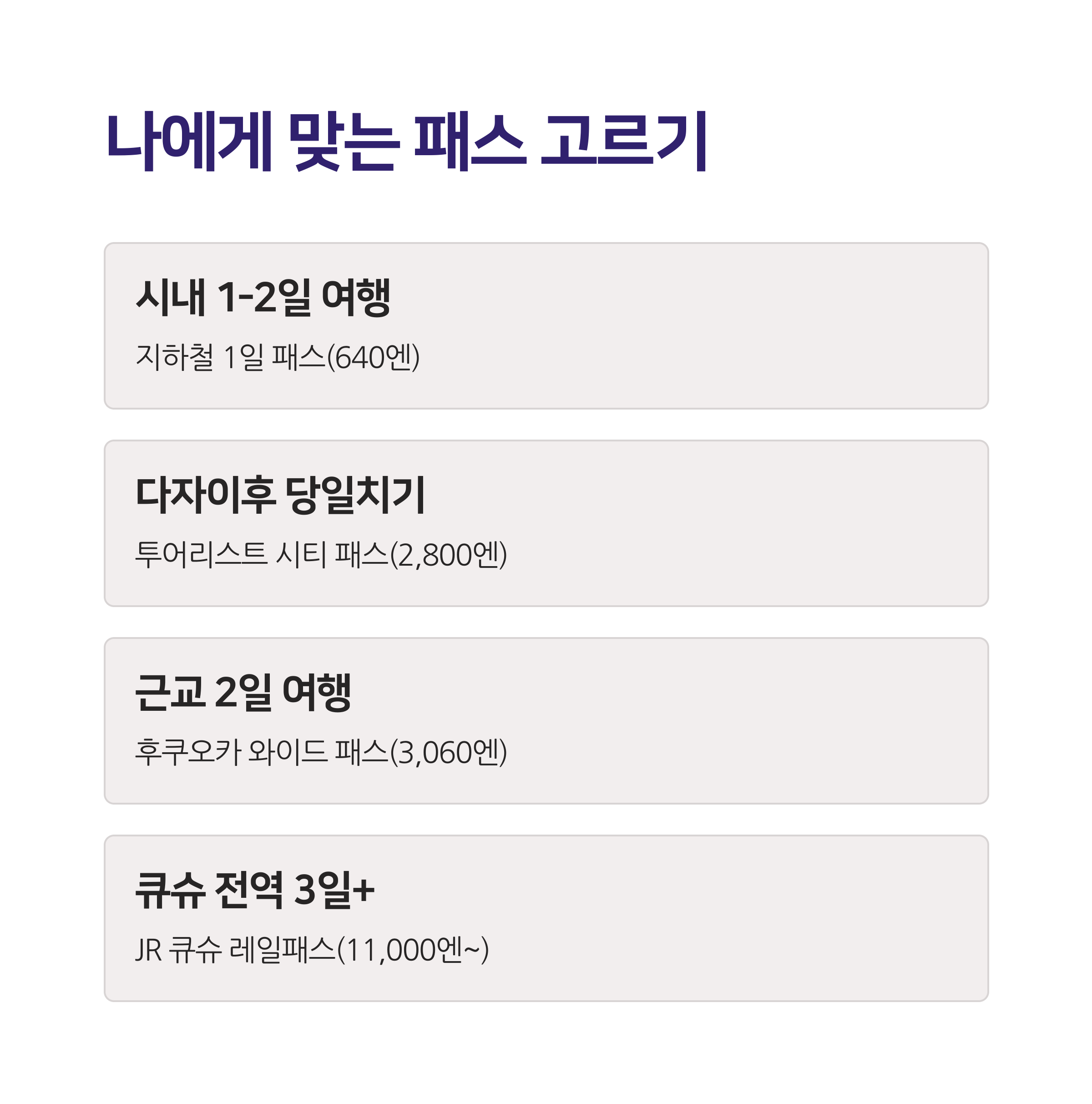후쿠오카 여행에서 활용할 수 있는 다양한 교통패스들이 있어요. 여행 일정과 방문할 지역에 따라 최적의 패스를 선택하는 것이 중요합니다.