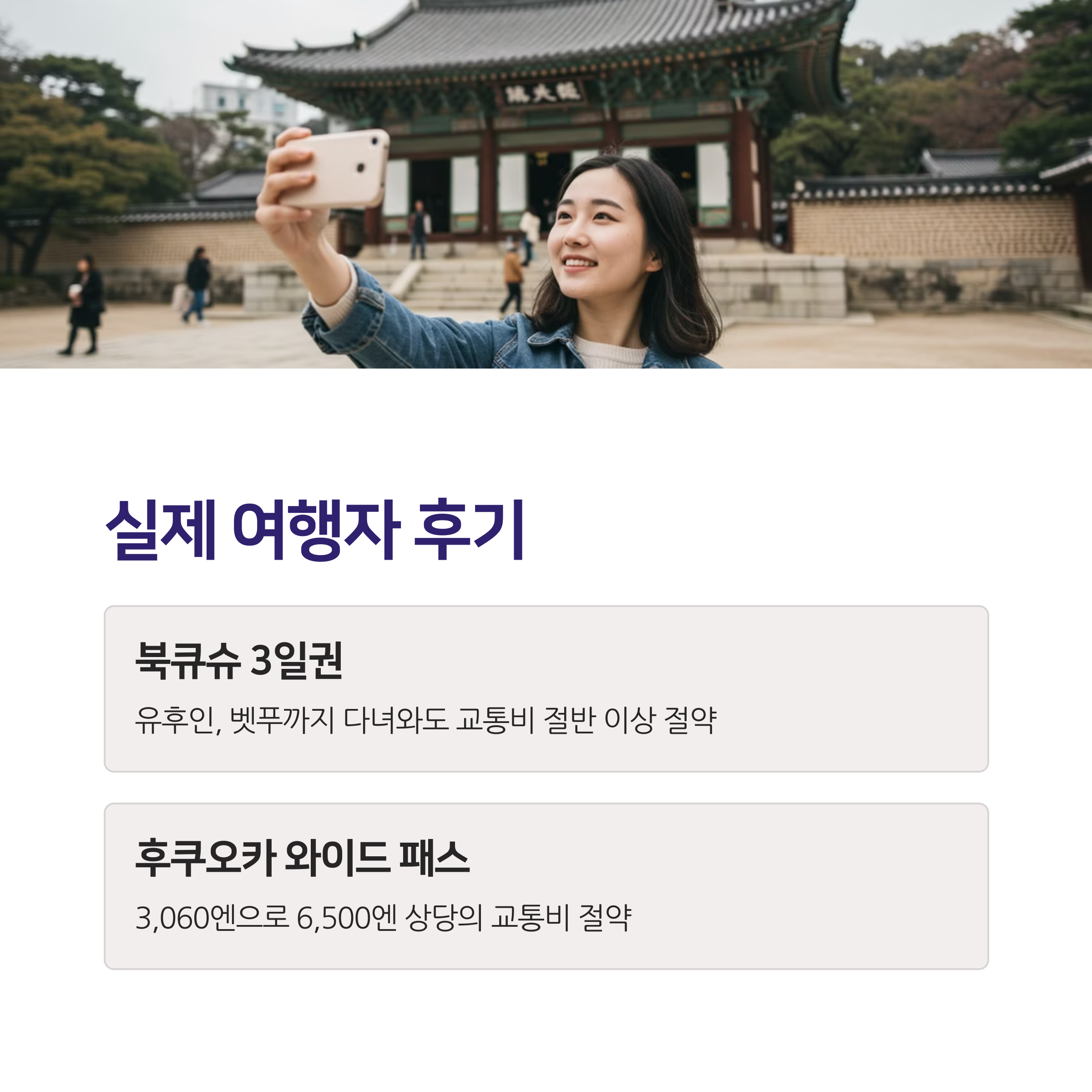 후쿠오카 여행에서 교통비는 전체 여행 경비의 큰 부분을 차지하지만, 적절한 JR 패스를 활용한다면 교통비의 절반 이상을 줄일 수 있어요. 여행 일정과 방문 지역에 맞는 패스를 선택해 더 많은 곳을 방문하고, 절약한 비용으로 맛있는 음식이나 쇼핑을 더 즐겨보세요!