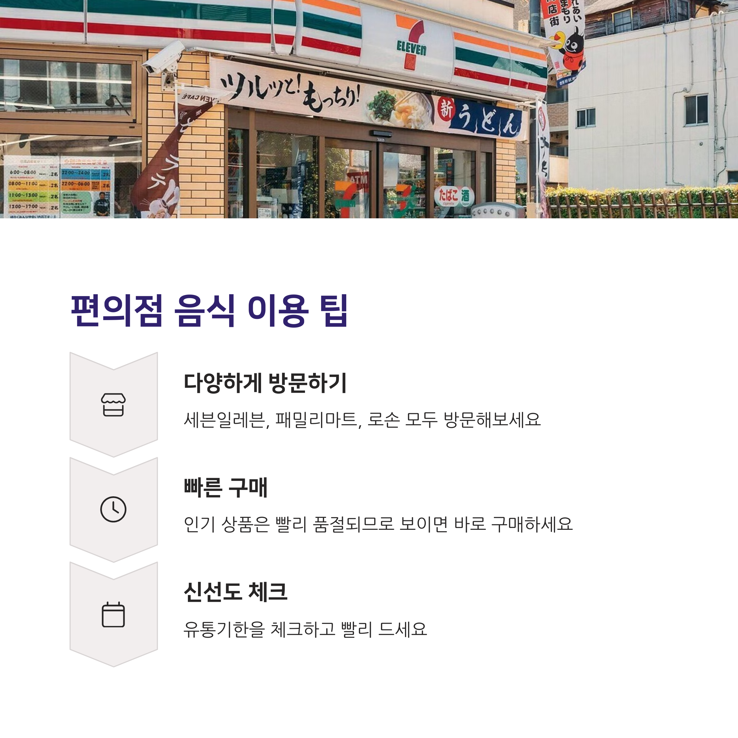 - 편의점마다 특색 있는 상품이 있으니 가능하면 세븐일레븐, 패밀리마트, 로손 모두 방문해보세요.