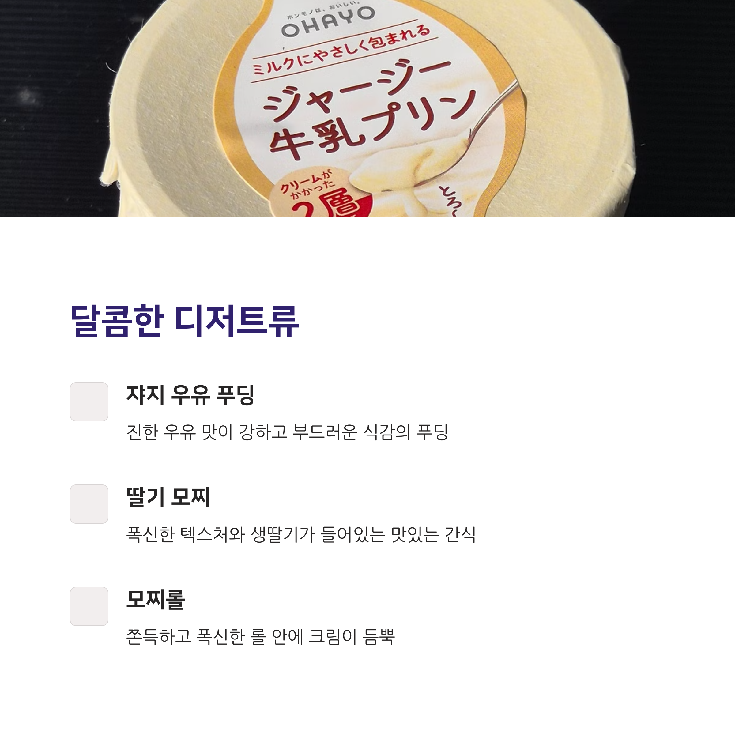디저트류는 로손이 특히 맛있는 것이 많아요. 쟈지 우유 푸딩 (じゃじ牛乳プリン)과 수플레 푸딩 (スフレプリン)이 특히 인기 있습니다.