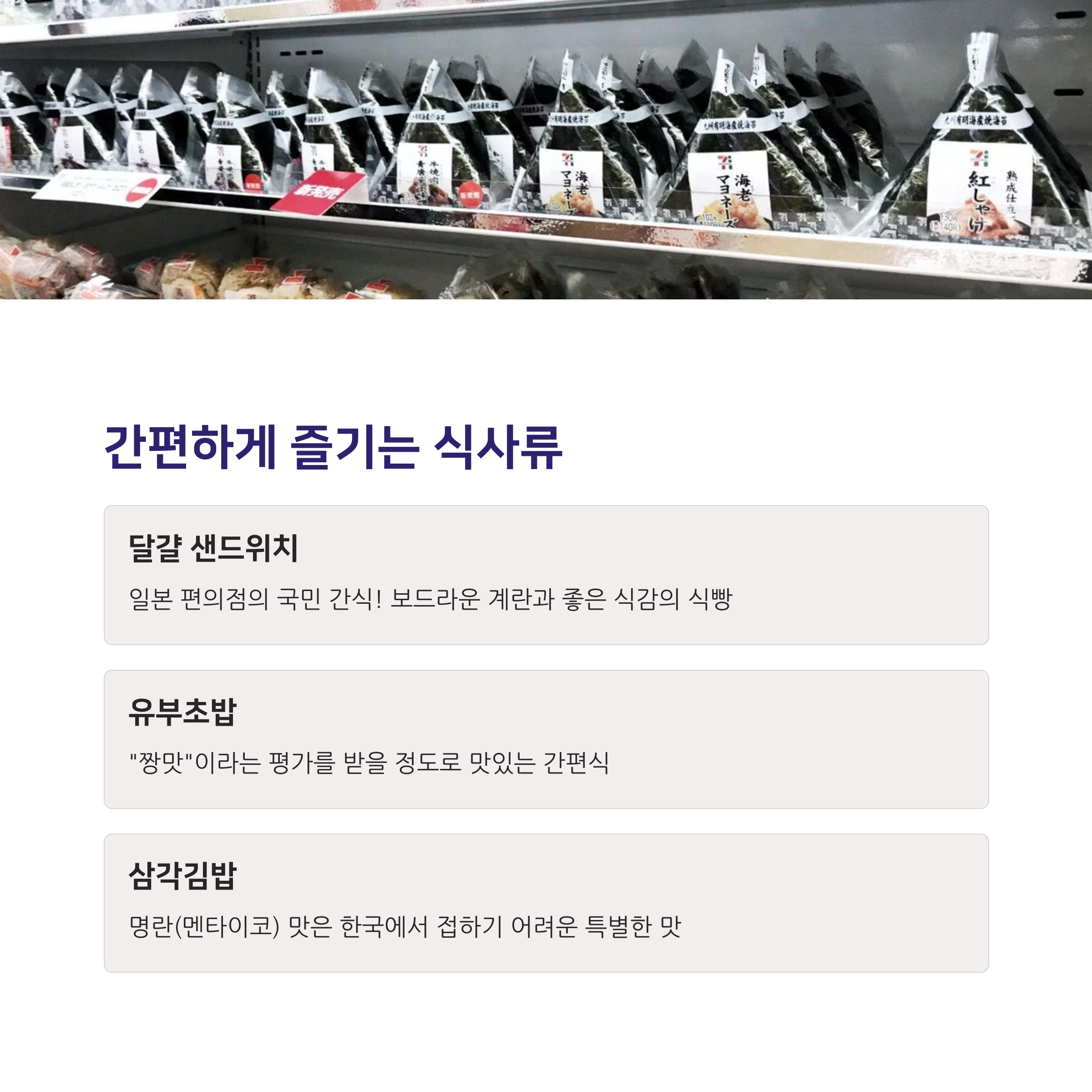 다양한 종류의 유부초밥과 삼각김밥은 간단한 한 끼로 완벽해요. 특히 유부초밥은 "짱맛"이라는 평가를 받을 정도로 맛있습니다. 명란(멘타이코) 삼각김밥은 한국에서 접하기 어려운 맛이라 호기심에 시도해볼 만해요.