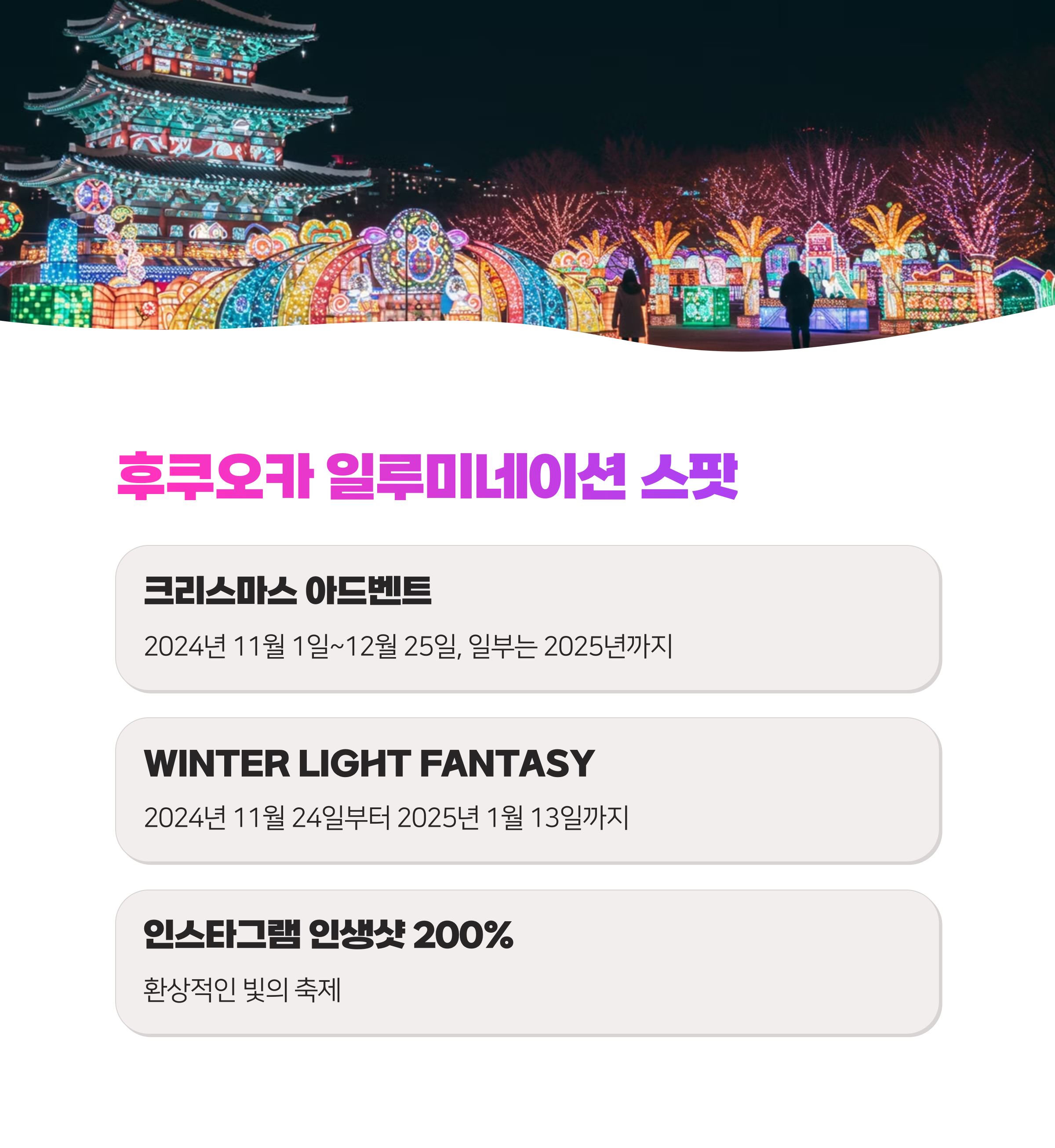 겨울 후쿠오카 여행을 계획 중이라면 이 환상적인 빛의 축제를 놓치지 마세요! 인스타그램 인생샷 200% 보장이랍니다!✨