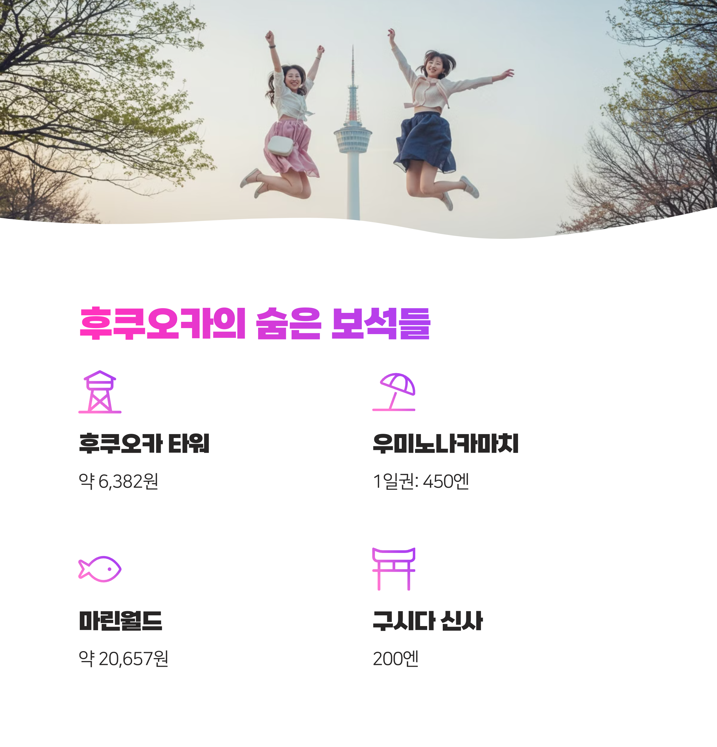 후쿠오카는 이 외에도 후쿠오카 타워(약 6,382원), 우미노나카마치 해변 공원(1일권: 450엔), 마린월드(약 20,657원), 구시다 신사(200엔) 등 매력적인 명소가 가득해요. 2025년에는 위에서 소개한 5개 핫플레이스를 중심으로 여행 계획을 세워보는 건 어떨까요?